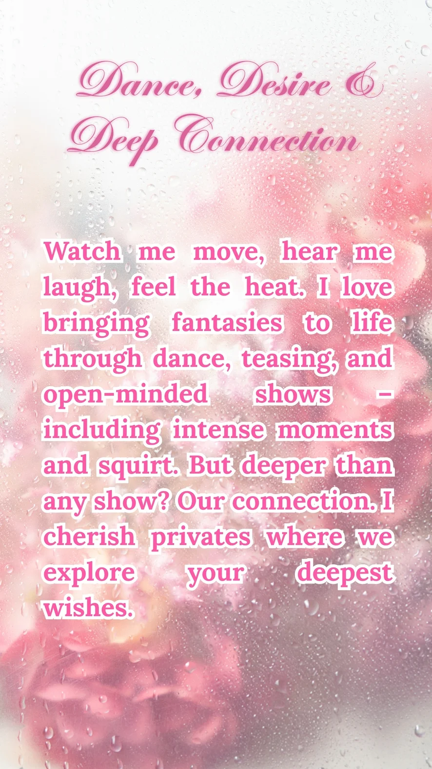 Ahegao, Camel Toe, Dirty Talk, Flashing, Heels, Leather, Smoking, Erotic Dance, Spanking, Topless, Handjob, Yoga, Gagging, Masturbation, Fingering, Upskirt, Cowgirl, Striptease, Foot Fetish, Facesitting, Dildo or Vibrator, Jerk-off Instruction, Orgasm, Doggy Style, Sex Toys, Humiliation, Oil Show, Shower, Squirt, Twerk